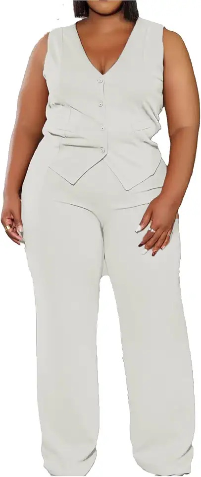 Plus size 2-piece pant suit includes button vest blazer with pockets for polished look and wide leg pants for comfort. Professional yet casual – great for work, interviews, or events. Tailored fit flatters curves; breathable fabric keeps you cool. Versatile outfit for business casual or dressed-up occasions.